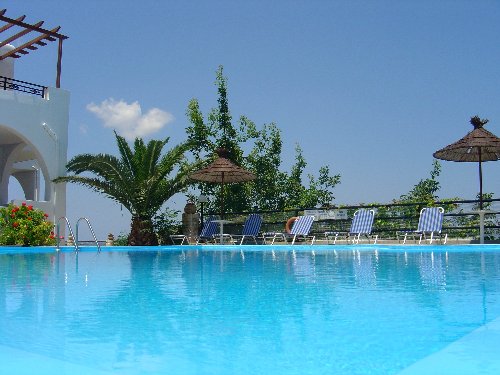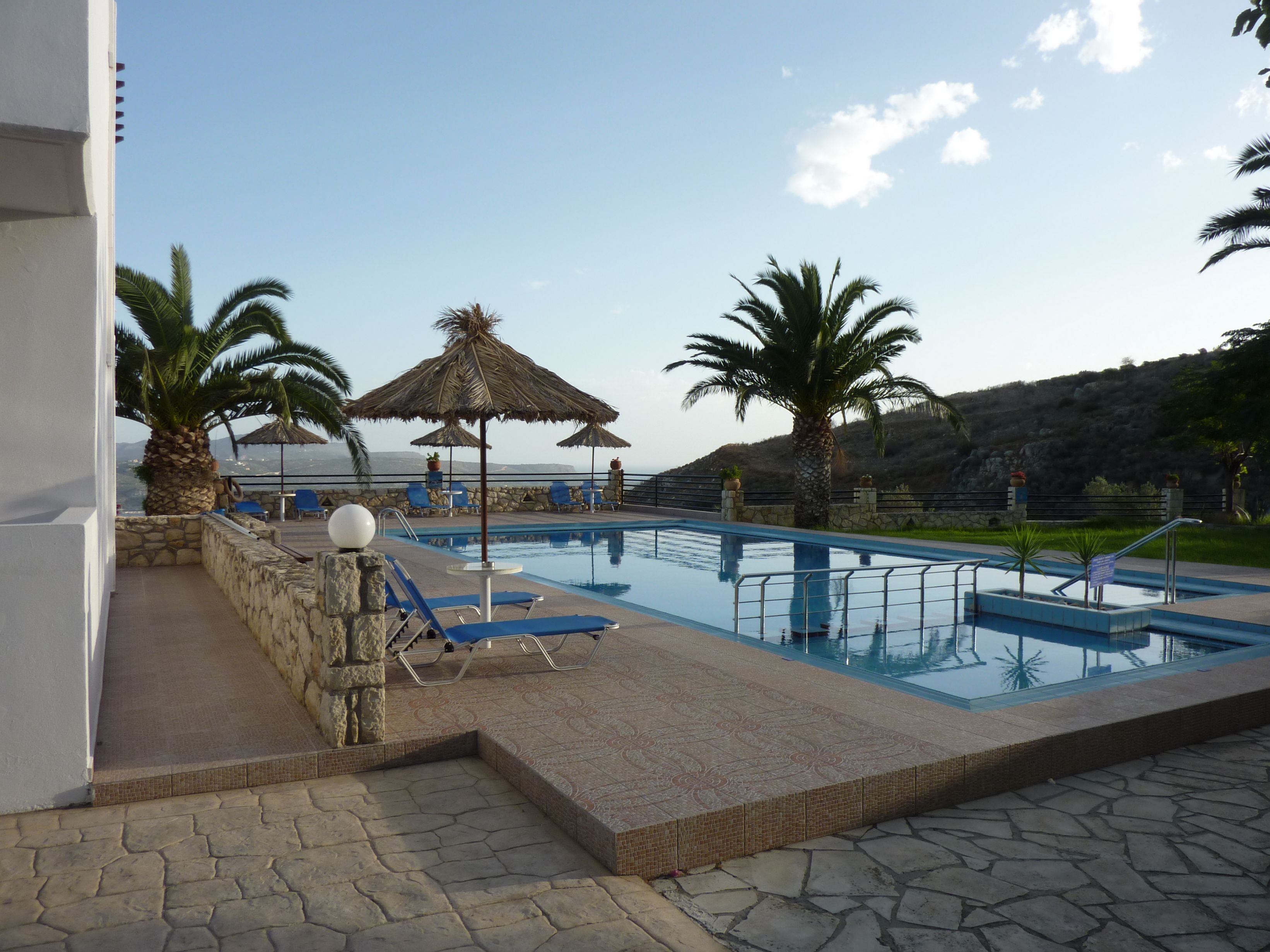 Aptera has a large swimming pool and a children’s pool. The beautiful garden with lush greenery and the palm trees offer cool shade to the guests who can enjoy the view while lying on the sun beds under the umbrellas.