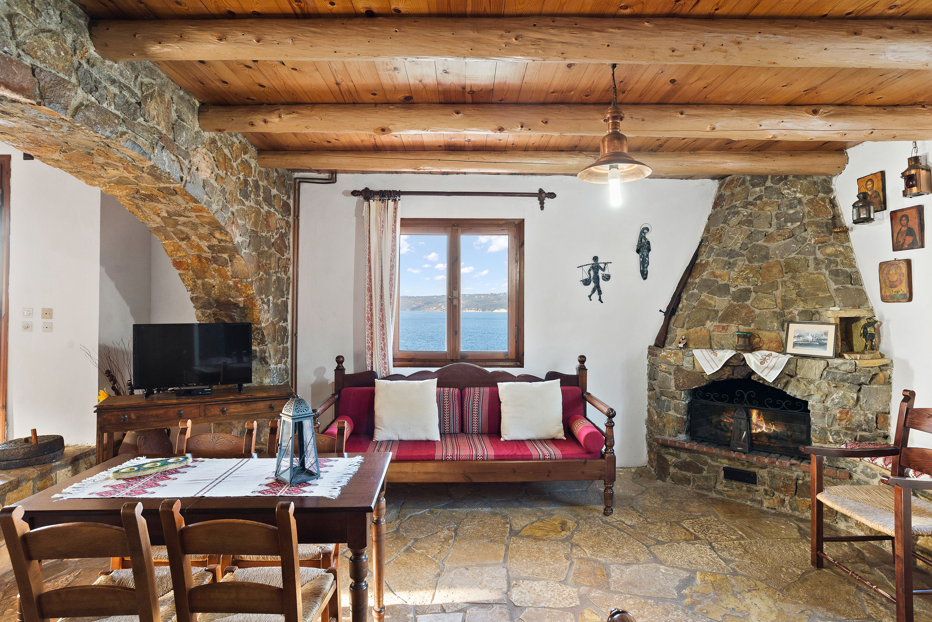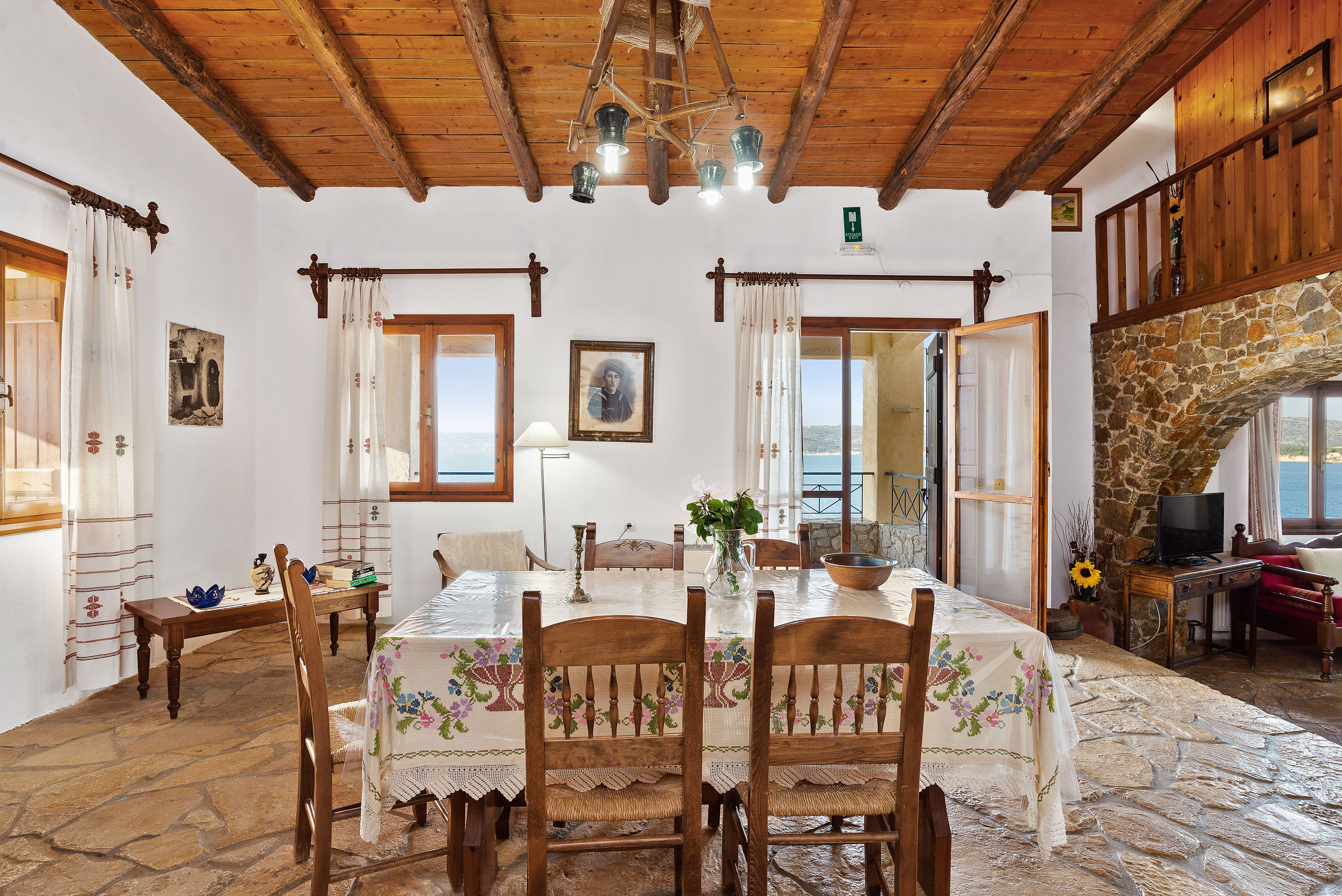 Cretan archway partitions the spacious dining area from the living area (with Cretan fireplace) and kitchen area.