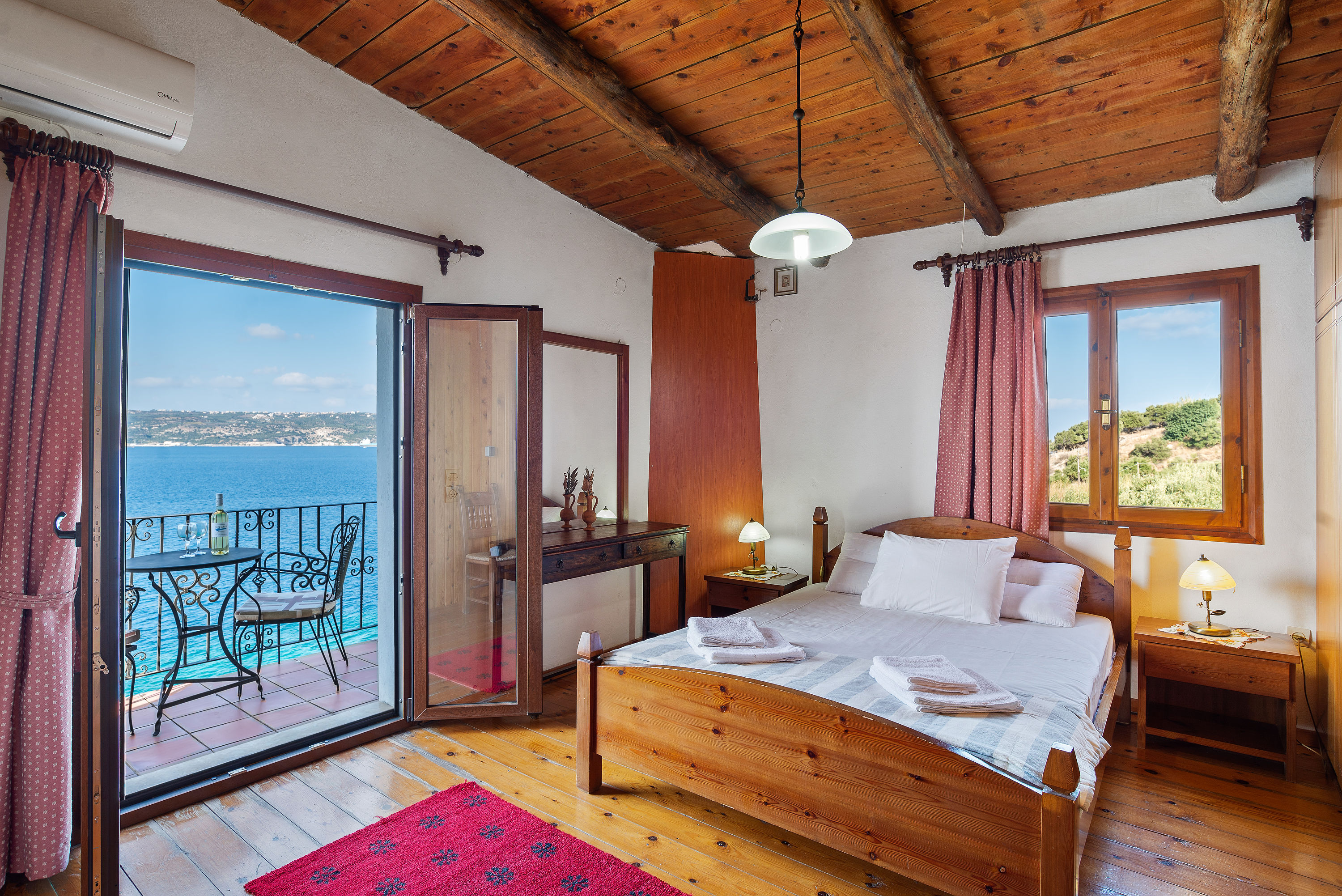 Standing alone (in foreground) and commanding magnificent views over Souda Bay is Katerina’s. This traditionally built property is within easy walking distance of a quiet beach reached from the property via a private path through the vines. It is also possible to walk 1/2 mile to a traditional kafenion in nearby Kalami. The house is accessed by car via a lane from Kalami.