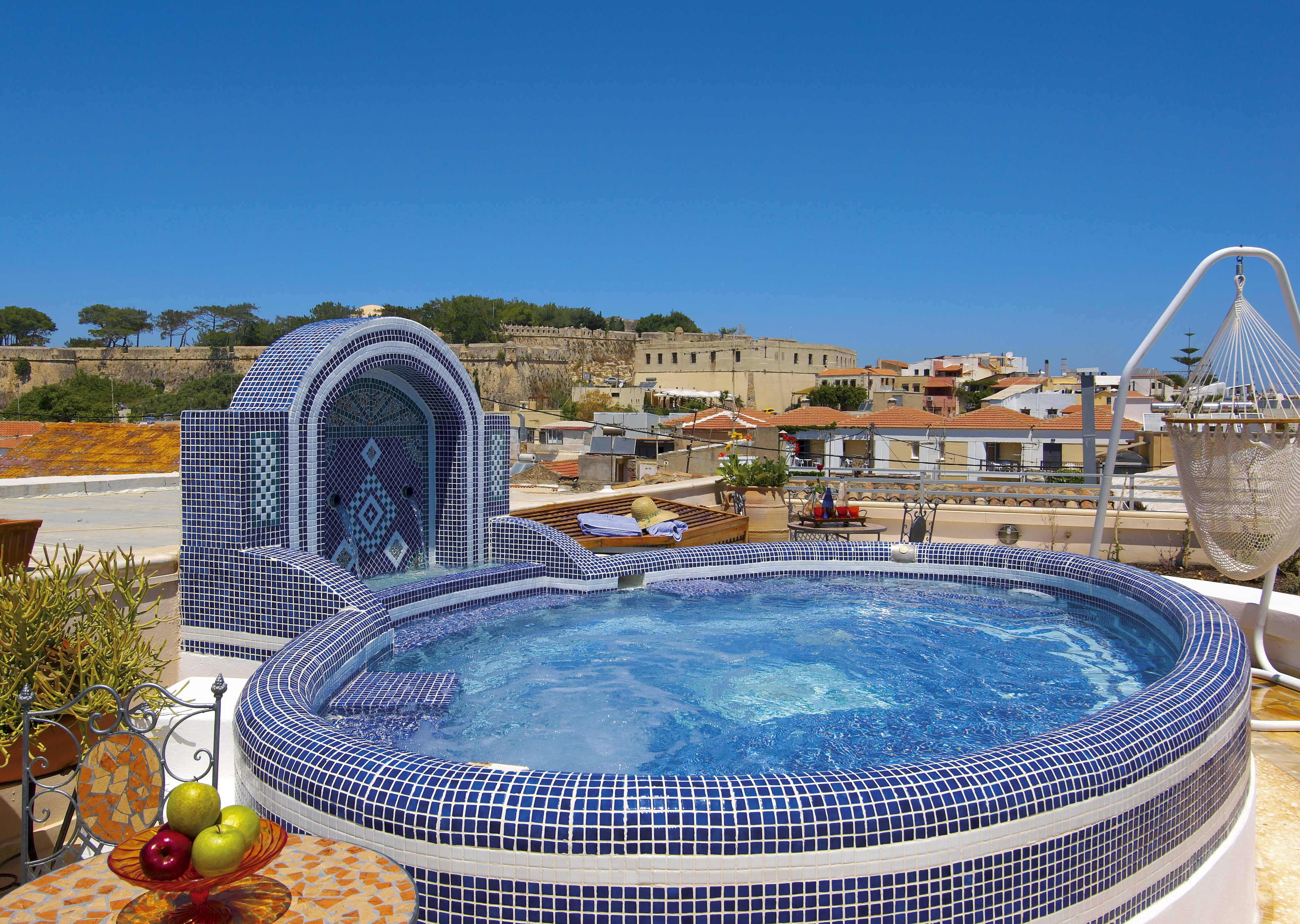 Breakfast is included and hotel guests can take advantage of the rooftop terrace, complete with jacuzzi and sunloungres, overlooking the old town and Fortezza castle. The Avli hotel can also organise wine tasting and cookery lessons. The beautiful suites come in 4 different rooms types, most with jacuzzi bathtubs, some with balconies with views of the old town and all with air con and wifi.