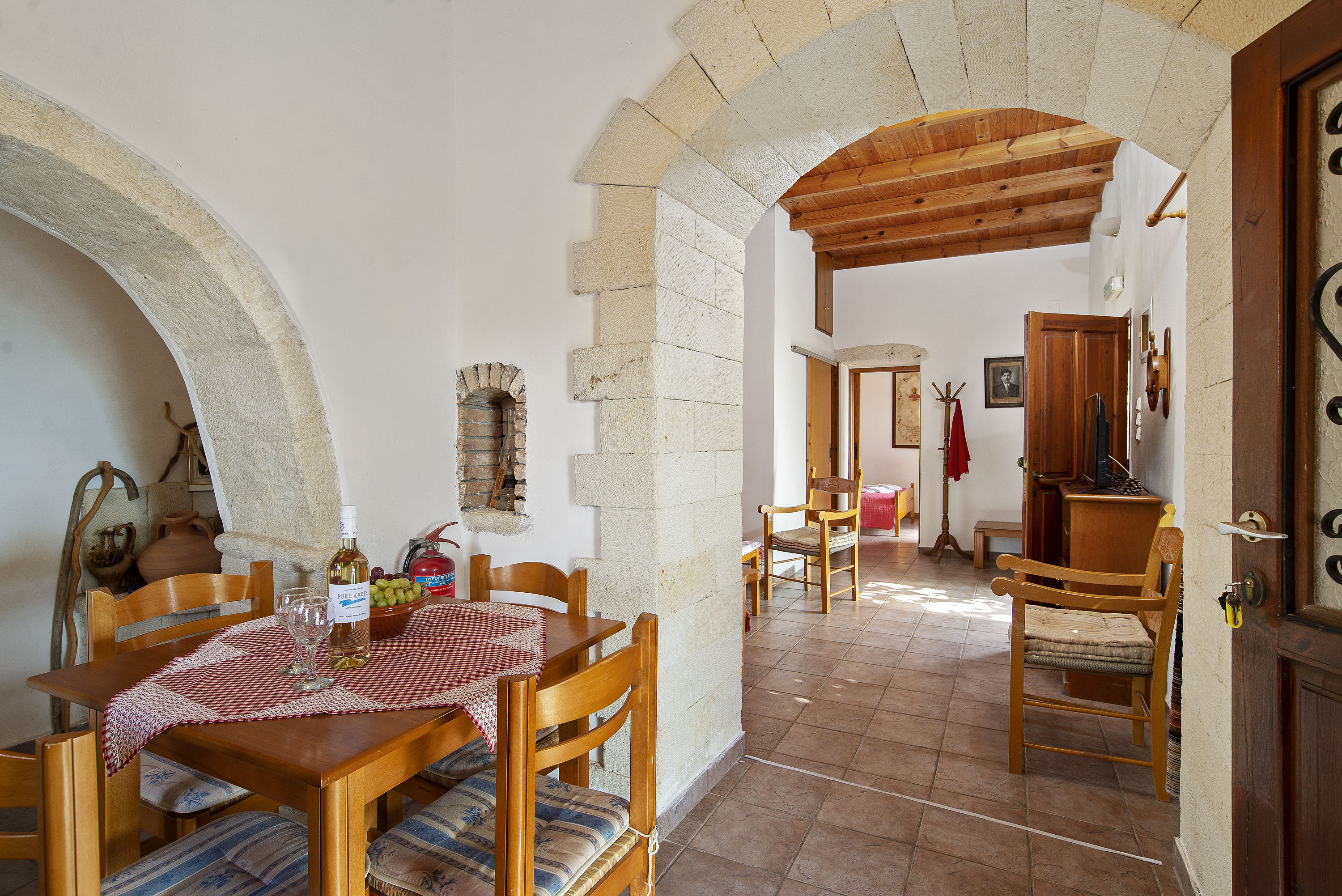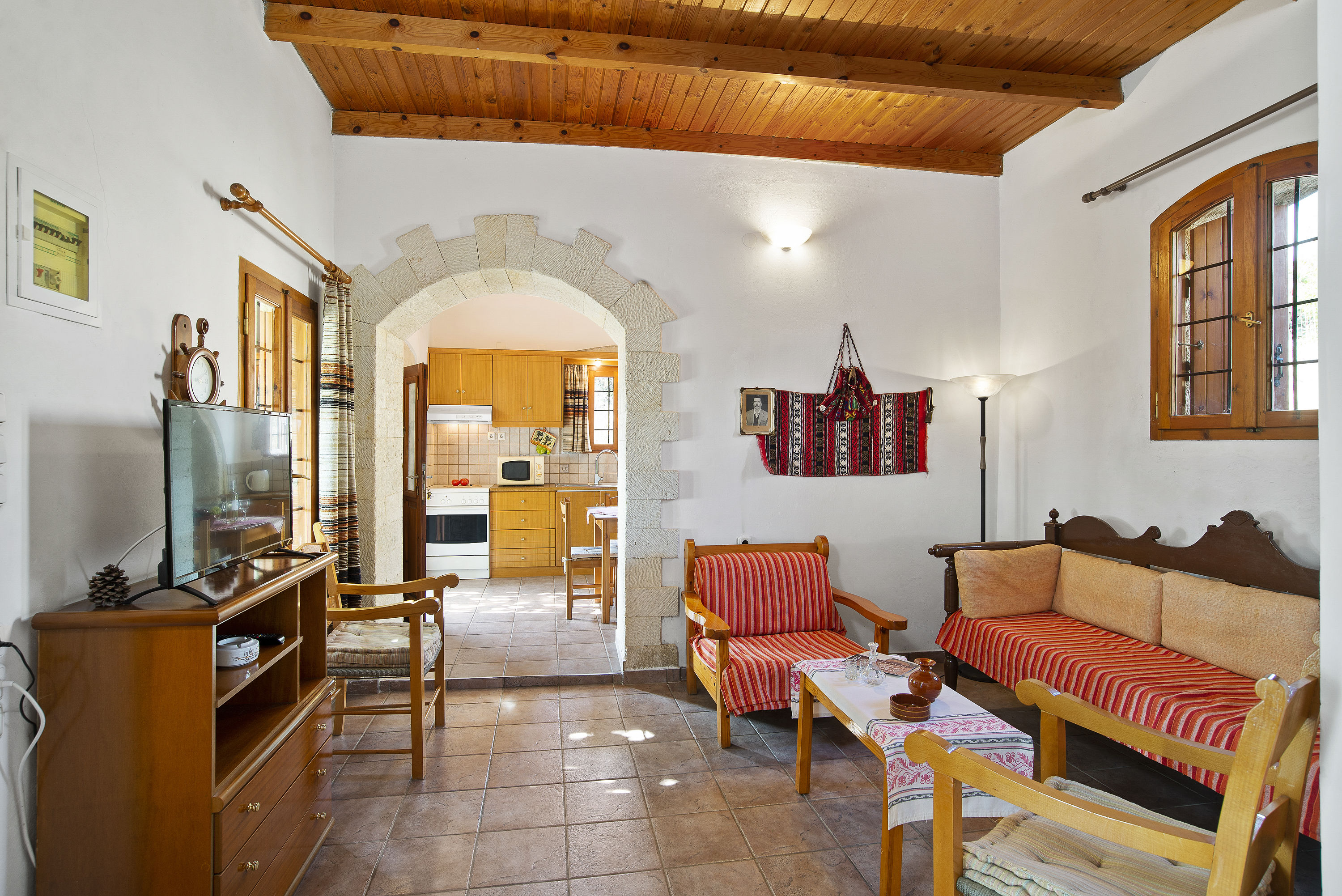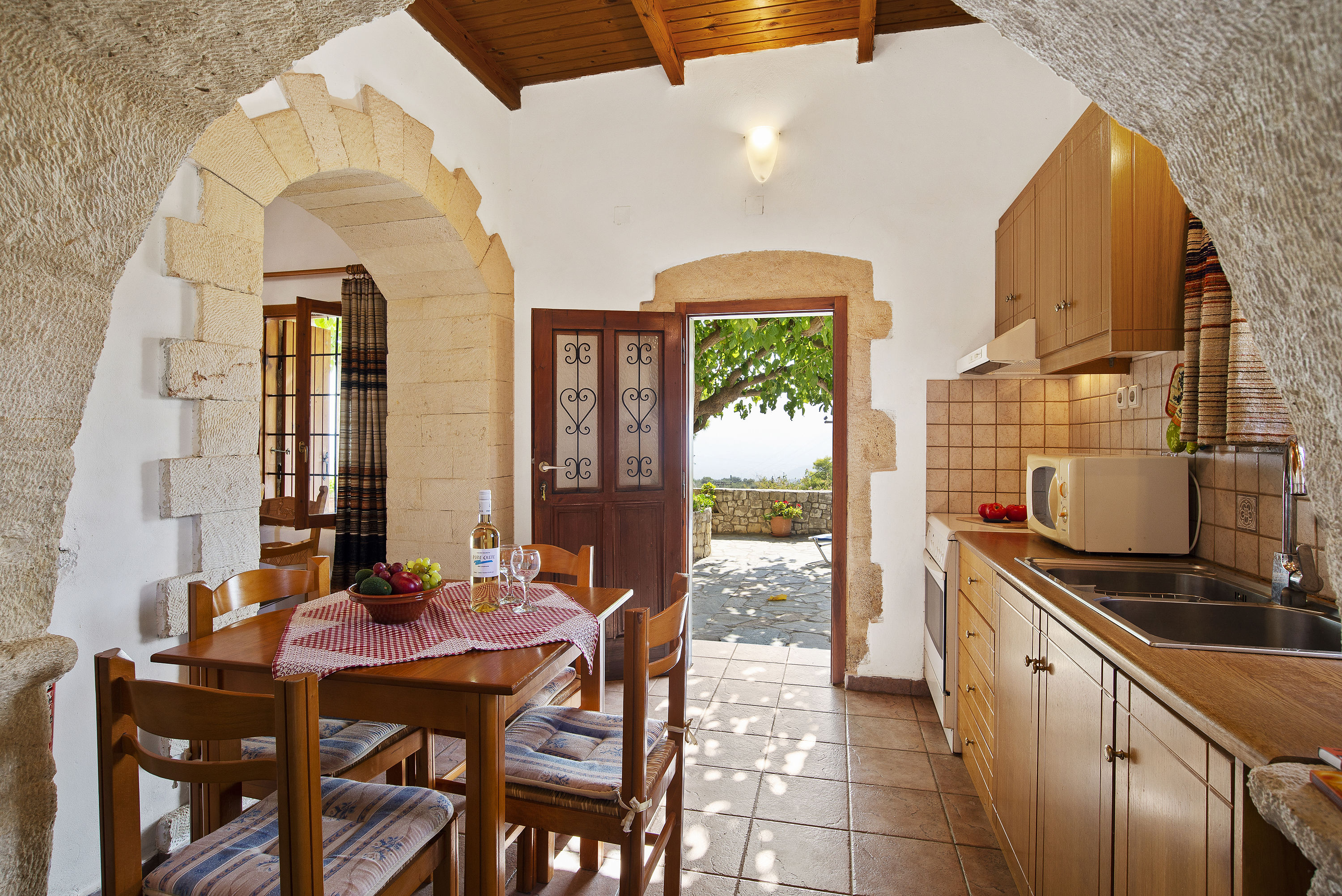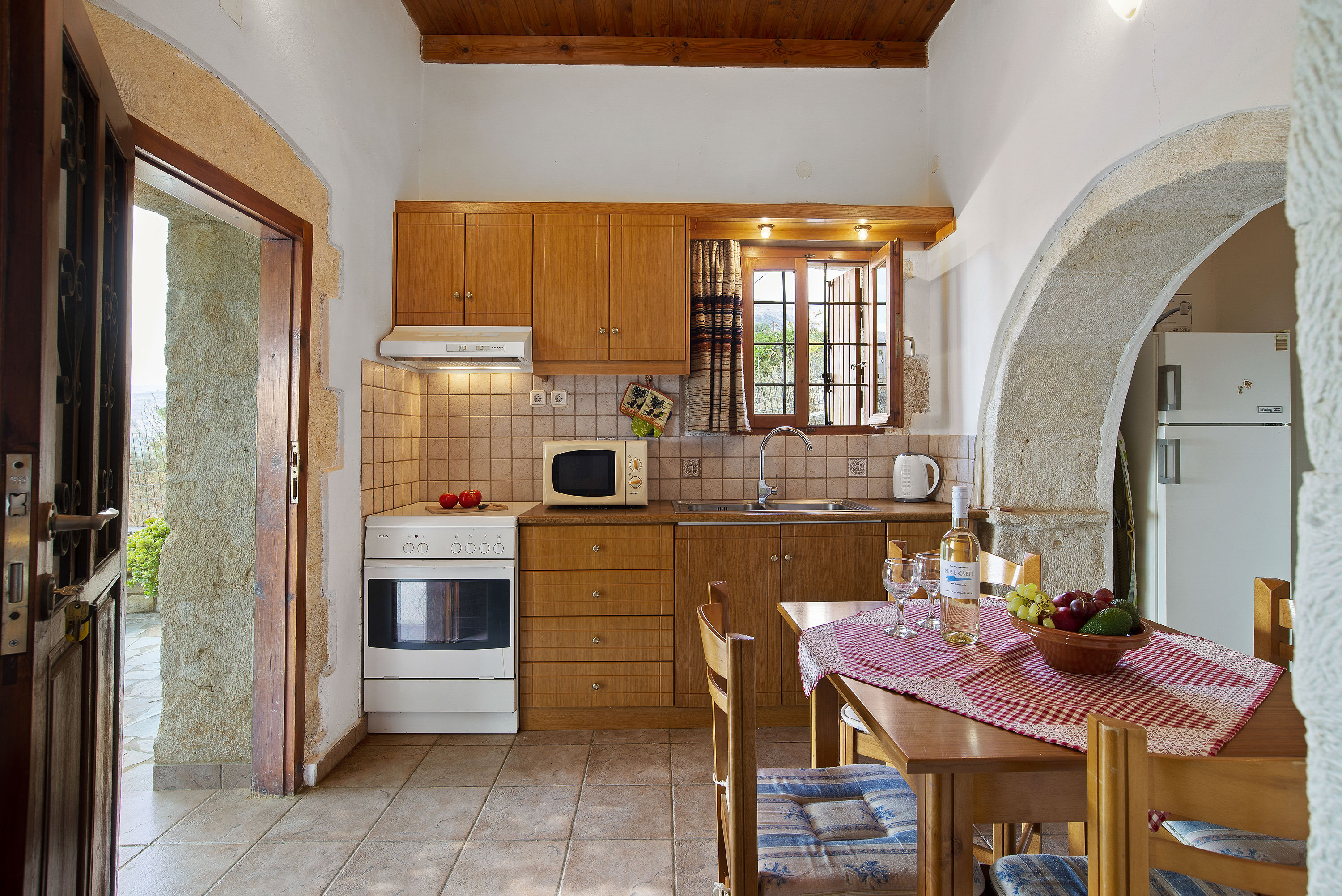Kitchen with original features including bread oven, living room with Cretan archway; bathroom with shower & double bedroom with air-conditioning.