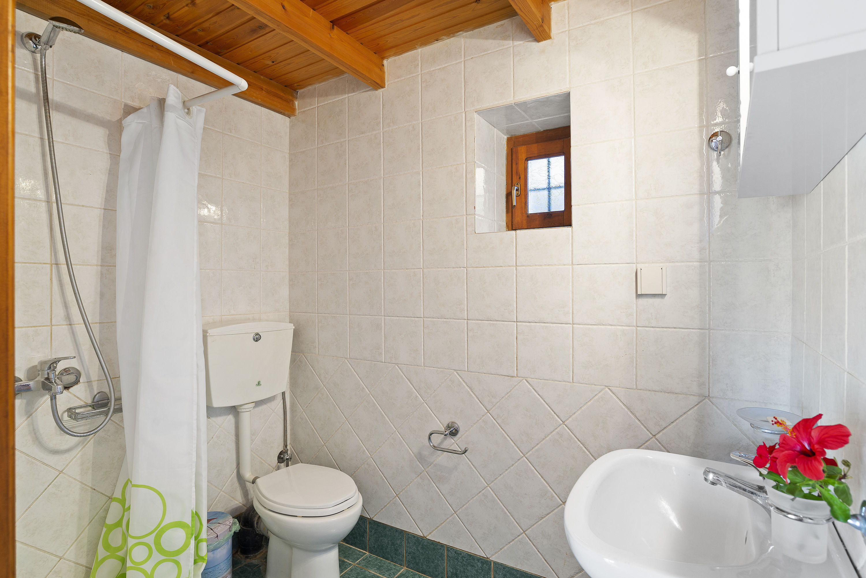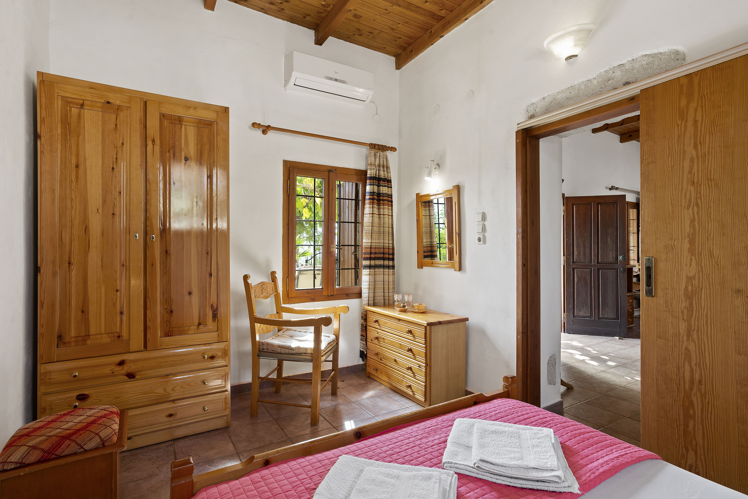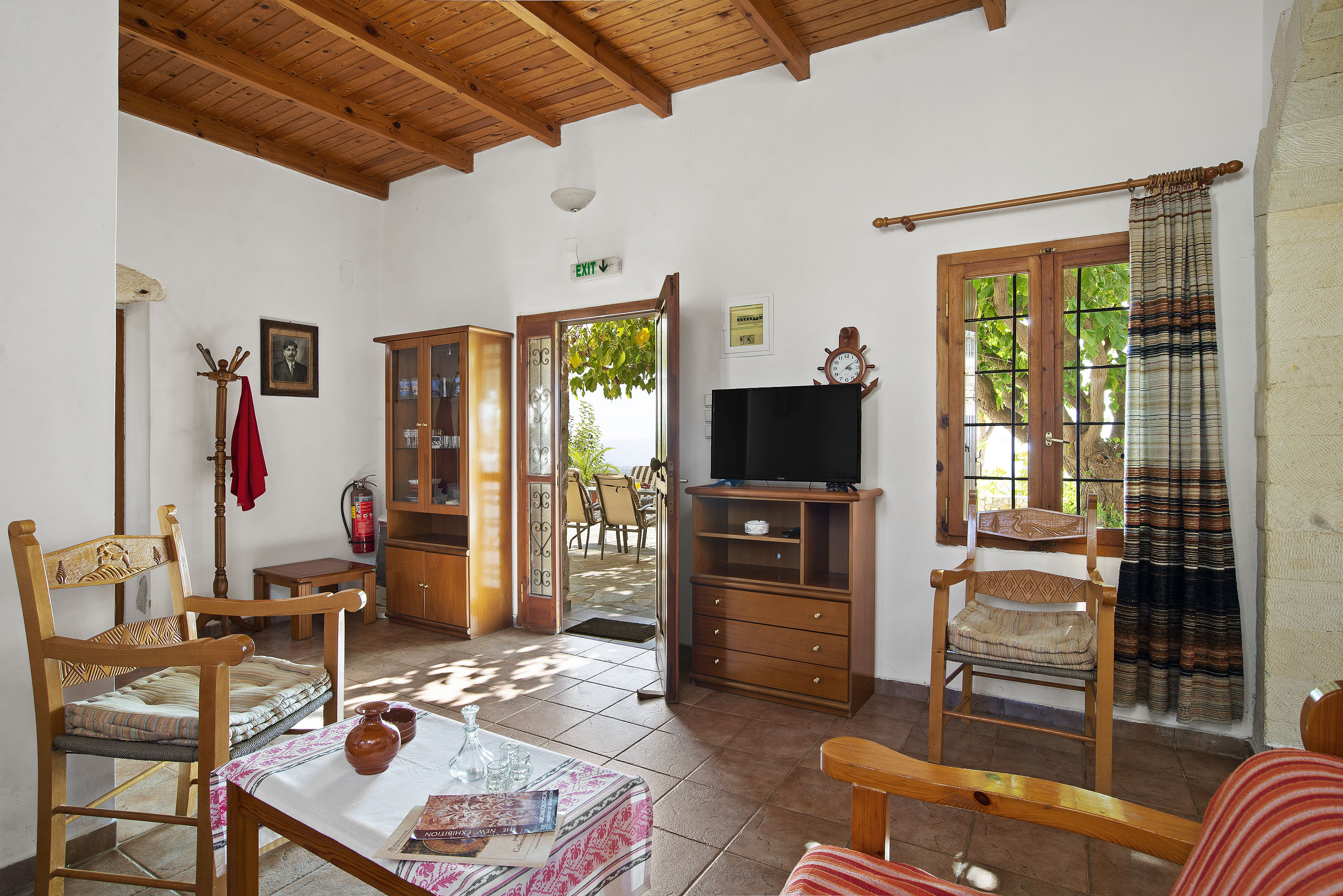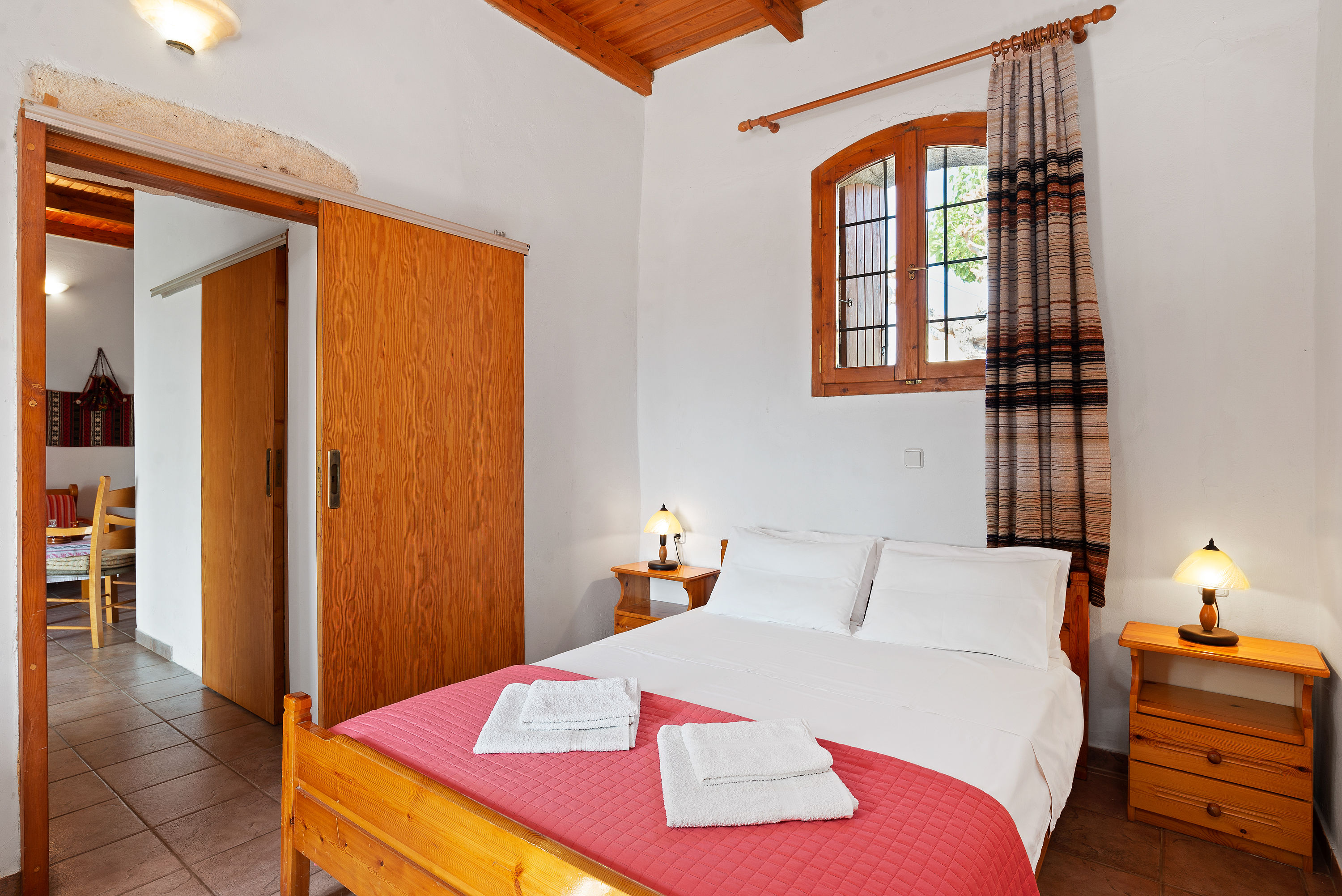 Kitchen with original features including bread oven, living room with Cretan archway; bathroom with shower & double bedroom with air-conditioning.