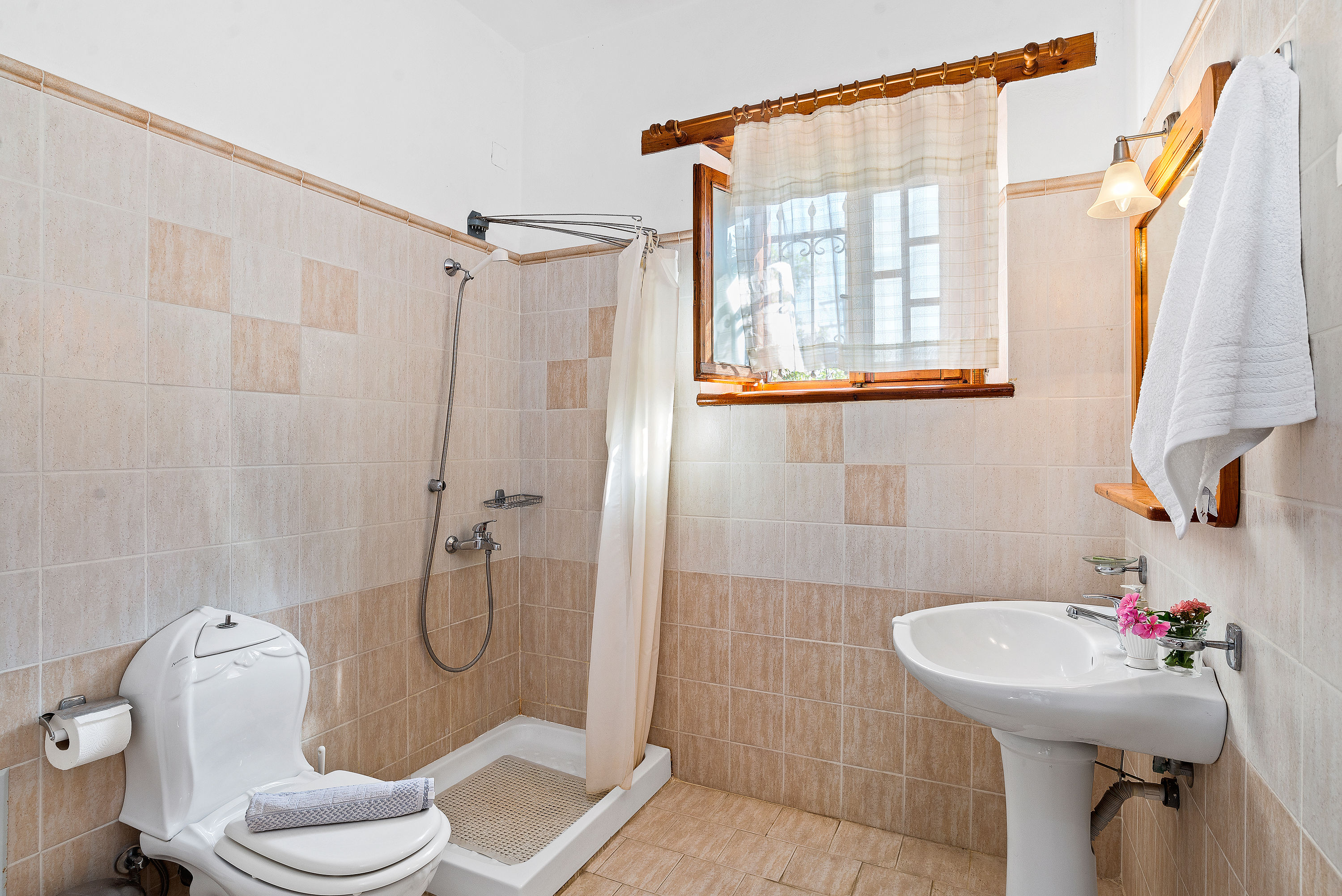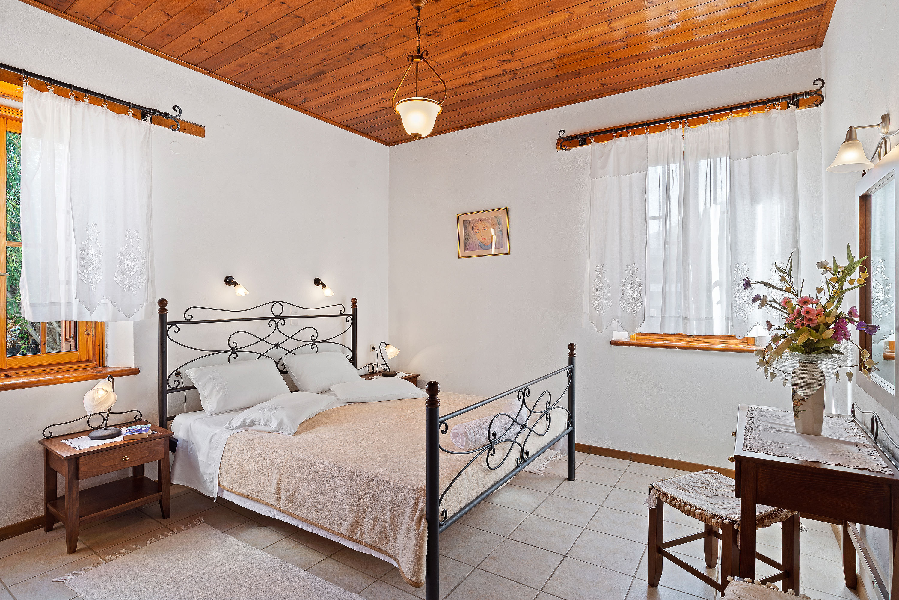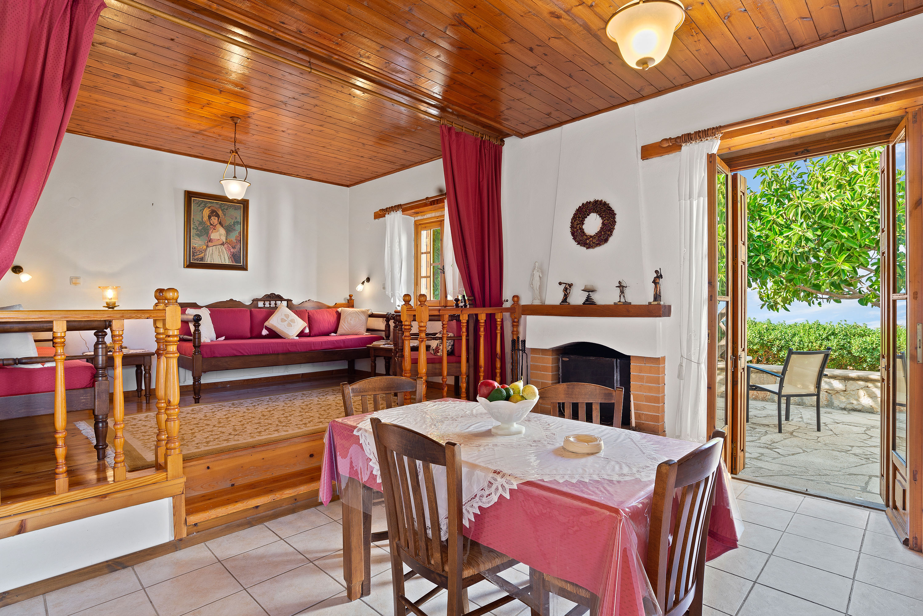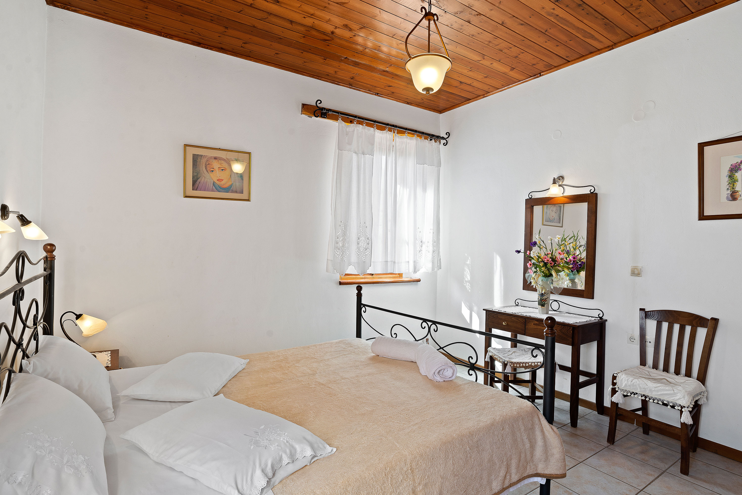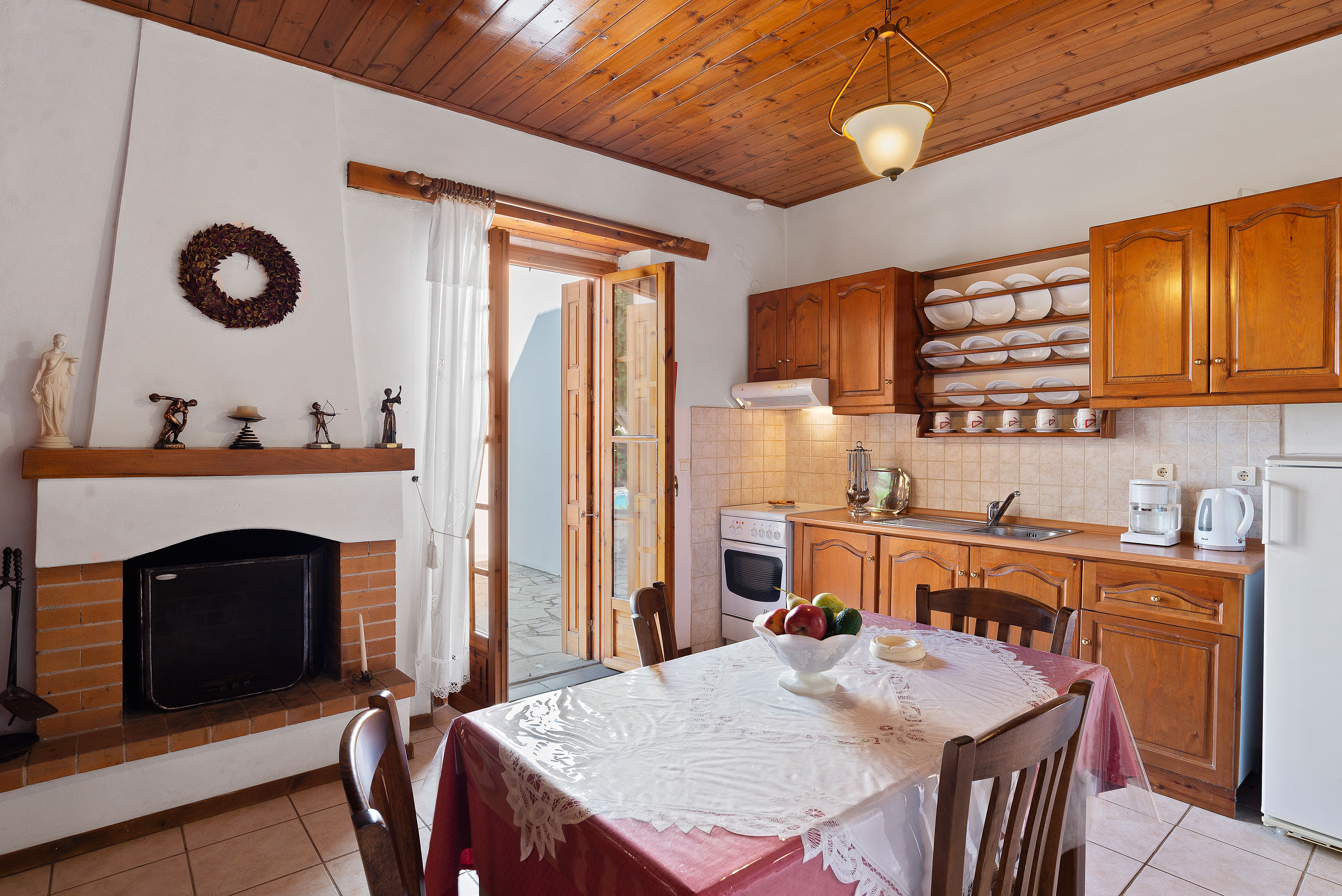 The houses are comfortable and are furnished in traditional style with tiled floor, Cretan furnishings and wooden ceilings. The houses are well equipped. For instance, in addition to the cooker, fridge with ice compartment etc in the kitchen area there is a coffee maker, sandwich maker and juice blender. The charming local owners live nearby.